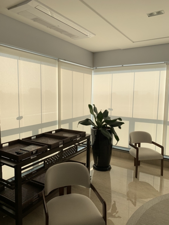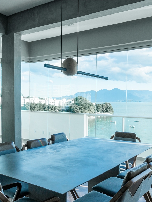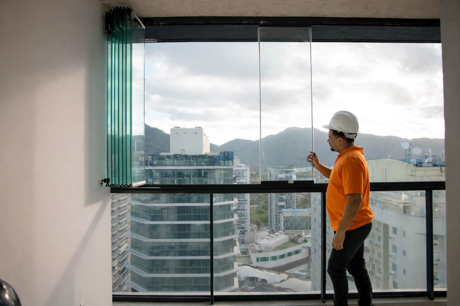 Painéis de vidro articulados, sem perfis verticais, que permite abrir e fechar totalmente a varanda e auxilia na proteção contra chuva, vento, poeira e ruídos, mantendo a vista livre.